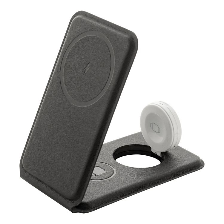 Lujoso soporte plegable para teléfono móvil y cargador inalámbrico fabricado en cuero PU reciclado. Con cargador magnético rápido inalámbrico (15 W), cargador inalámbrico (5 W) para auriculares (solo Apple®) y cargador inalámbrico (2,5 W) para relojes inteligentes (Apple® y Samsung®). Incluye anillo metálico autoadhesivo para utilizar la función magnética en cualquier dispositivo con carga inalámbrica. Compatible con iPhone® 12 o posterior. Incluye cable de carga USB, de color negro