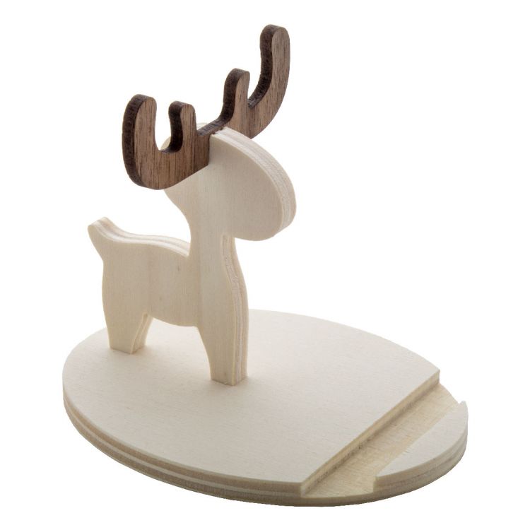 Soporte para móvil de madera contrachapada de abedul con forma de reno. Se entrega en paquete plano