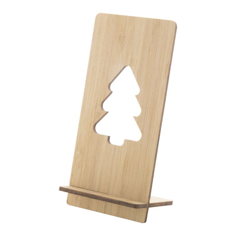 Soporte de escritorio para móvil en contrachapado de bambú con motivo navideño troquelado. Se entrega en paquete plano