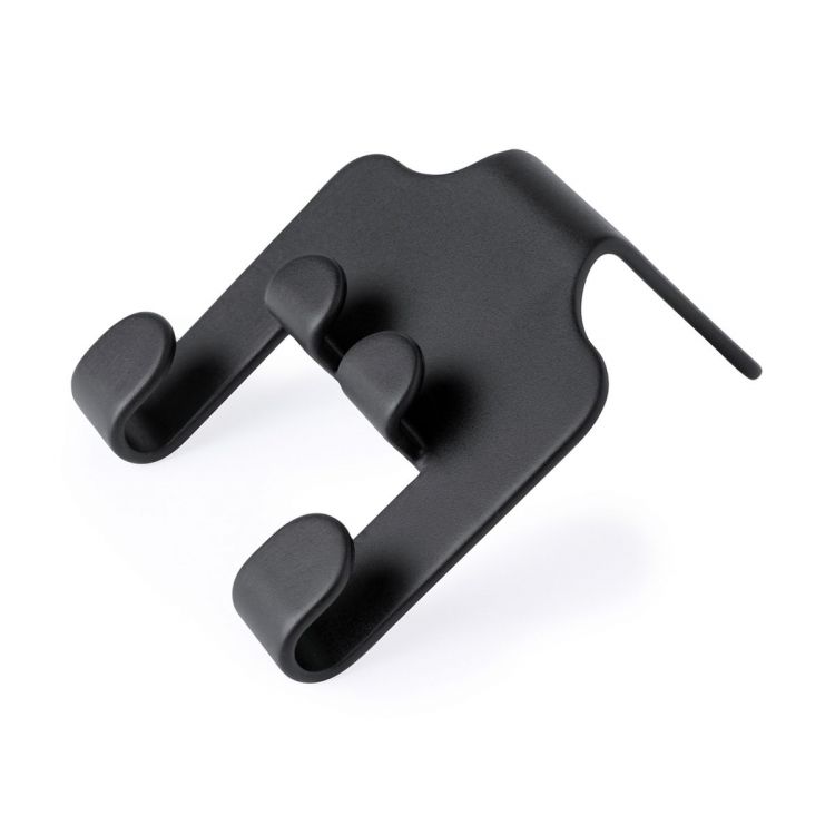 Resistente soporte fabricado en ABS. Fácil instalación mediante el gancho abierto diseñado para colocarse en el reposacabezas, con soporte para dispositivos móviles y dos ganchos adicionales para bolsas. Presentado en bolsa individual. (color negro)