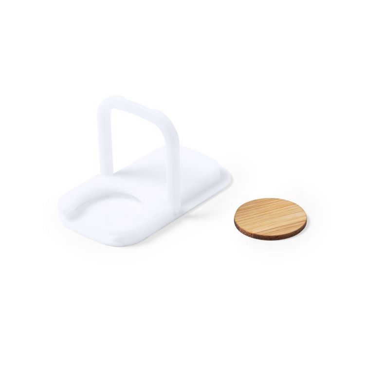 Soporte multifunción para smartphone, con moneda para carro de la compra integrada y anilla/soporte plegable. Cuerpo fabricado en resistente ABS de acabado blanco, con moneda en bambú. Con adhesivo de fijación extra fuerte y libre de residuos al despegarlo del dispositivo. (color blanco)