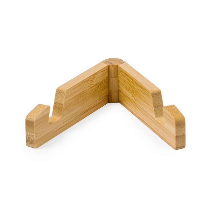 Soporte plegable para dispositivo móvil fabricado en resistente bambú. Con patas ajustables y presentado individualmente en bolsa de papel reciclado. Materiales como el bambú fomentan la utilización de materias primas naturales, reduciendo las emisiones contaminantes. Proviene de una planta de gran resistencia y versatilidad, con crecimiento y regeneración rápidos, siendo una excelente alternativa al uso de madera tradicional. (color natural)
