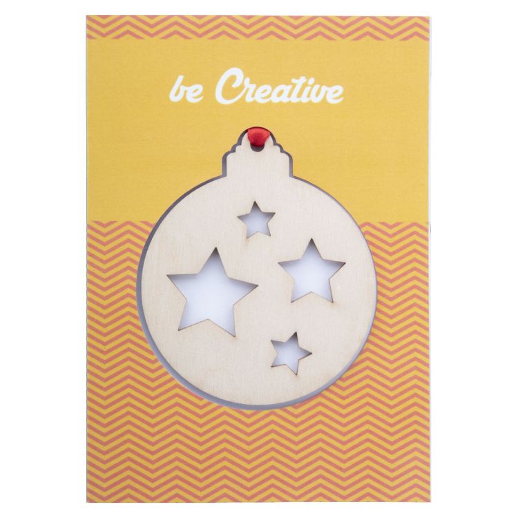 Tarjeta de Navidad de papel hecha a medida con gráfico personalizado por ambas caras, incluye adorno de árbol de Navidad de madera con lazo rojo. Incluye sobre postal C6. Cantidad mínima: 100 unidades