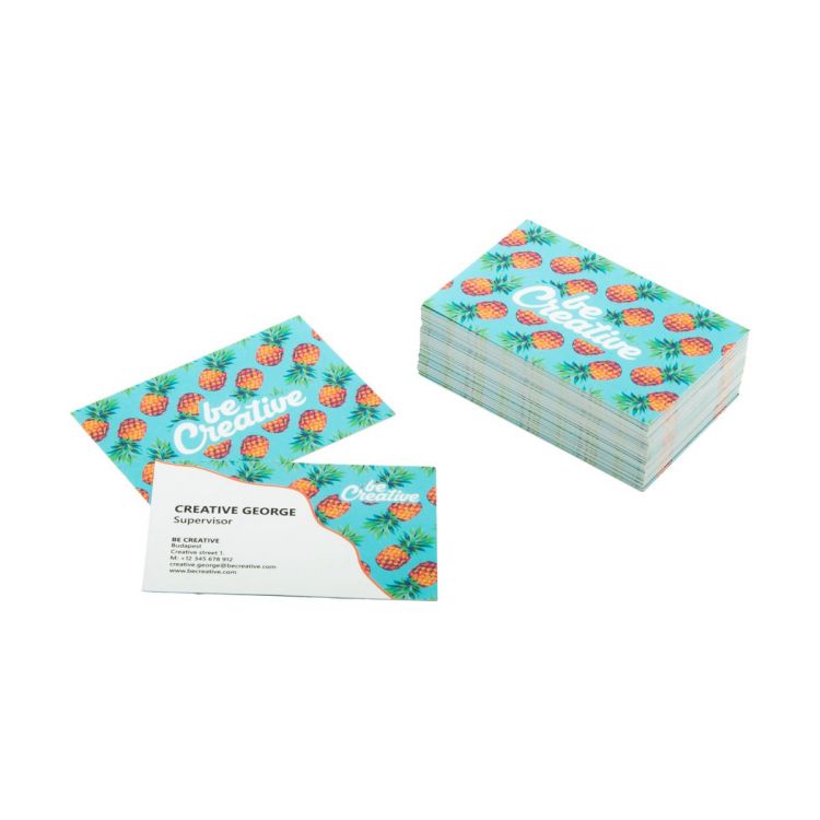 100 tarjetas de visita personalizadas con gráficos impresos a todo color por ambas caras. Papel blanco mate, 350 g/m². En caja de papel blanco
