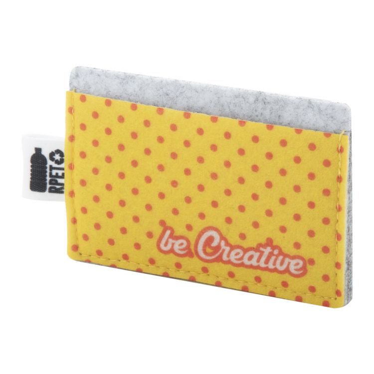 Tarjetero de fieltro RPET hecho a medida, con 3 ranuras para tarjetas y frontal impreso a todo color. Con etiqueta RPET distintiva. El precio incluye impresión por sublimación. Cantidad mínima: 50 unidades