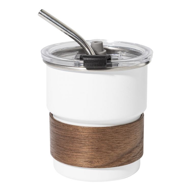 Taza de viaje de pared simple, acero inoxidable reciclado, con asa de madera de nogal, tapa de plástico y pajita de acero inoxidable reciclado. 260 ml.