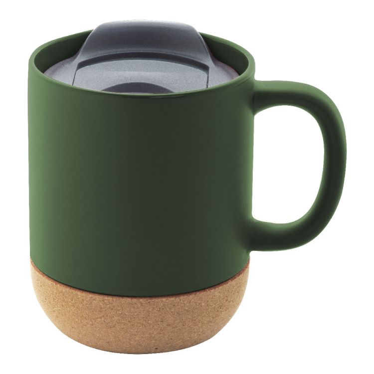 Taza de cerámica de alta calidad con base de corcho natural y tapa para beber de plástico PP. Con acabado exterior mate e interior brillante. 325 ml. En caja de papel kraft.