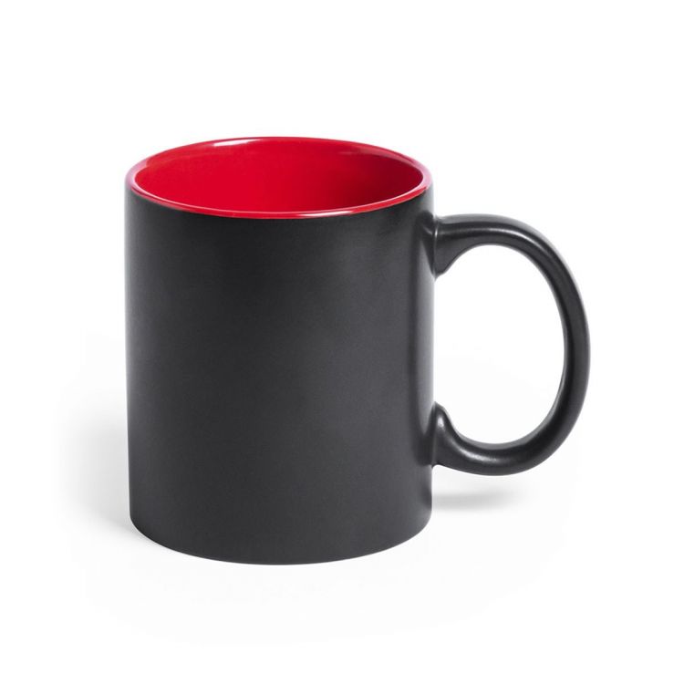 Taza de cerámica de alta calidad de 350ml de capacidad. Parte exterior en color negro, especialmente diseñada para marcaje en láser, e interior en variada gama de vivos colores. Al grabar el logotipo en la parte exterior, se muestra el color del interior de la taza. Presentada en caja individual.Disponible manual de instrucciones en español e inglés.