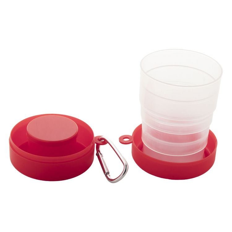 Vaso plegable de plástico PP reciclado con compartimento pastillero y mosquetón metálico. 220 ml. Sin BPA.