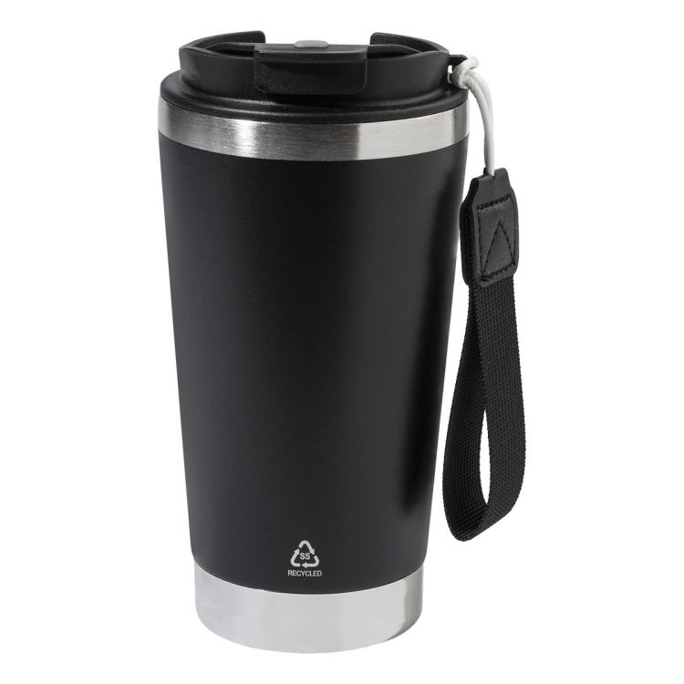 Vaso térmico aislante de doble pared de acero inoxidable reciclado con tapa de PP para beber y correa de transporte del mismo color. 430 ml.
