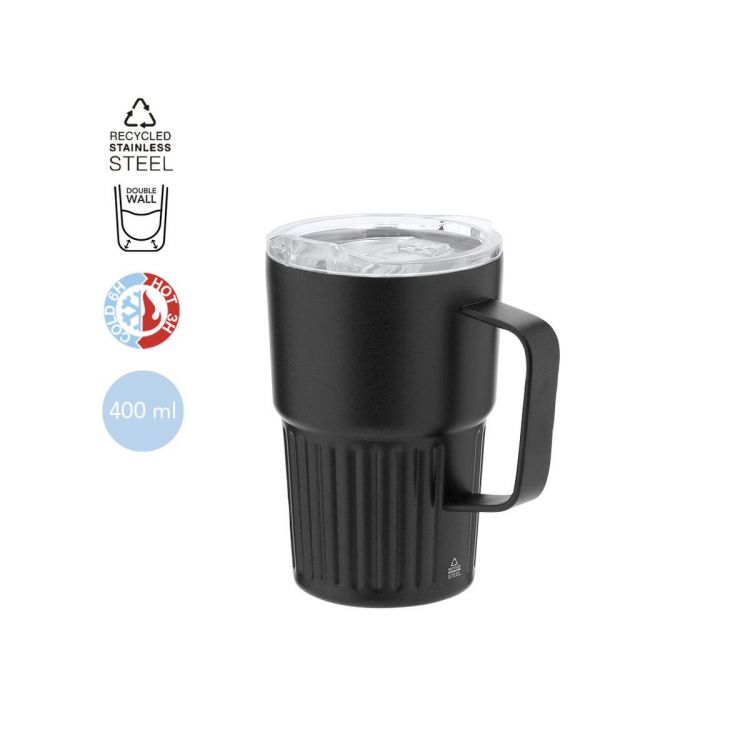 Taza térmica en Acero Inox Reciclado de doble pared y 400 ml de capacidad. Exterior en acabado biselado mate. Incluye tapadera con sistema de cierre a presión transparente y dosificador de fácil apertura abatible, libre de BPA. Es ideal para tener en tu escritorio, mesa o en cualquier superficie donde disfrutar tranquilamente de tu bebida favorita. Incluye distintivo de Acero Inox Reciclado.El acero es uno de los materiales más demandados y que puede encontrarse casi en todas partes, desde productos de uso diario a grandes construcciones. Con innumerables propiedades, entre las que cabe destacar la durabilidad y su alto grado de reutilización, convirtiéndolo en una alternativa muy valorada en soluciones de sostenibilidad. Debidamente tratado, permite obtener nuevos recursos de infinita utilización.