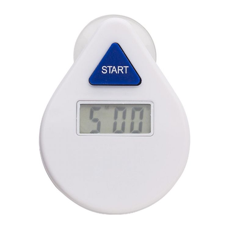 Temporizador de ducha digital en ABS con ventosa en la parte trasera y pulsador en la parte delantera.