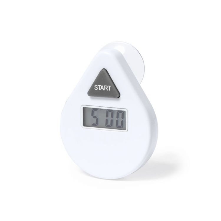Temporizador fabricado en resistente ABS de acabado blanco y con fijación por ventosa. Pantalla LCD de fácil lectura, con botón de control de cuenta atrás (5 minutos). Alimentación con pila (de botón incluida). Presentada en caja individual de diseño kraft, con manual de instrucciones en español e inglés. (color blanco)