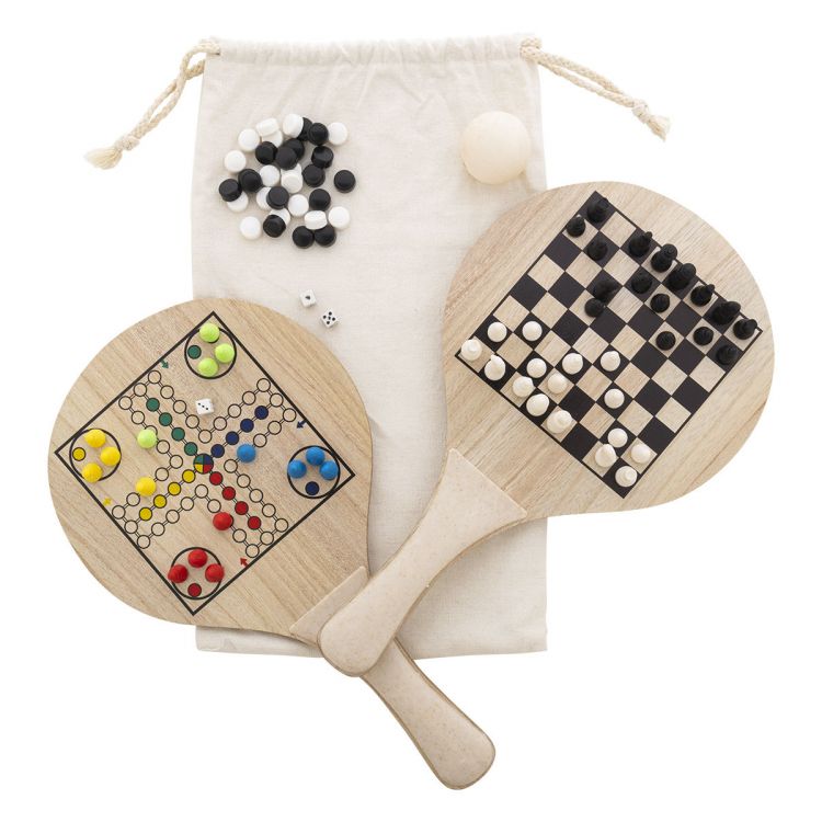Juego de tenis de playa de madera y plástico ecológico de paja de trigo con 2 raquetas y una pelota. Incluye 3 juegos de mesa para jugar con las raquetas. En bolsa de algodón con cordón