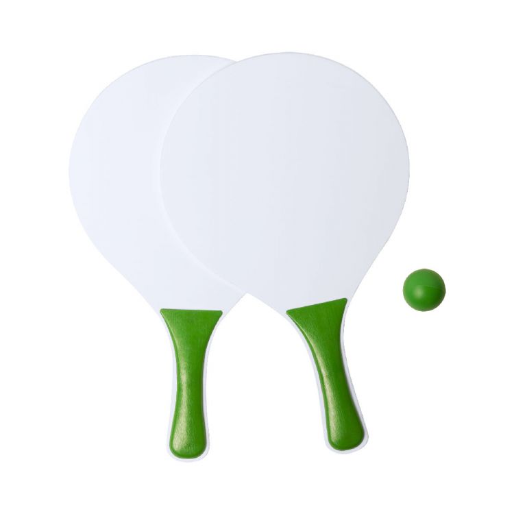 Tenis de playa con 2 raquetas grandes y una pelota, de madera y plástico.