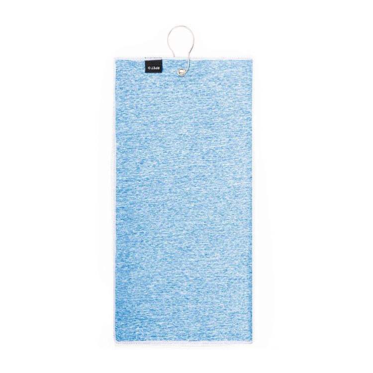 Toalla de golf fabricada en RPET, absorbente y suave con dimensiones de 40x60 cm. En el centro, incorpora una argolla reforzada y un mosquetón de acople, ambos elaborados en acero inox. Con logotipo RPET en etiqueta.El material RPET se elabora a partir de plástico reciclado, para así fomentar la reutilización de residuos plásticos y ayudar a la sostenibilidad del planeta.