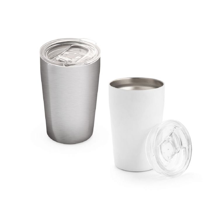 Vaso de viaje para sublimación de acero inoxidable de doble pared. Incluye una tapa transparente con apertura deslizante. Capacidad hasta 380 mL. Suministrado en una caja de regalo. ø77 x 120 mm