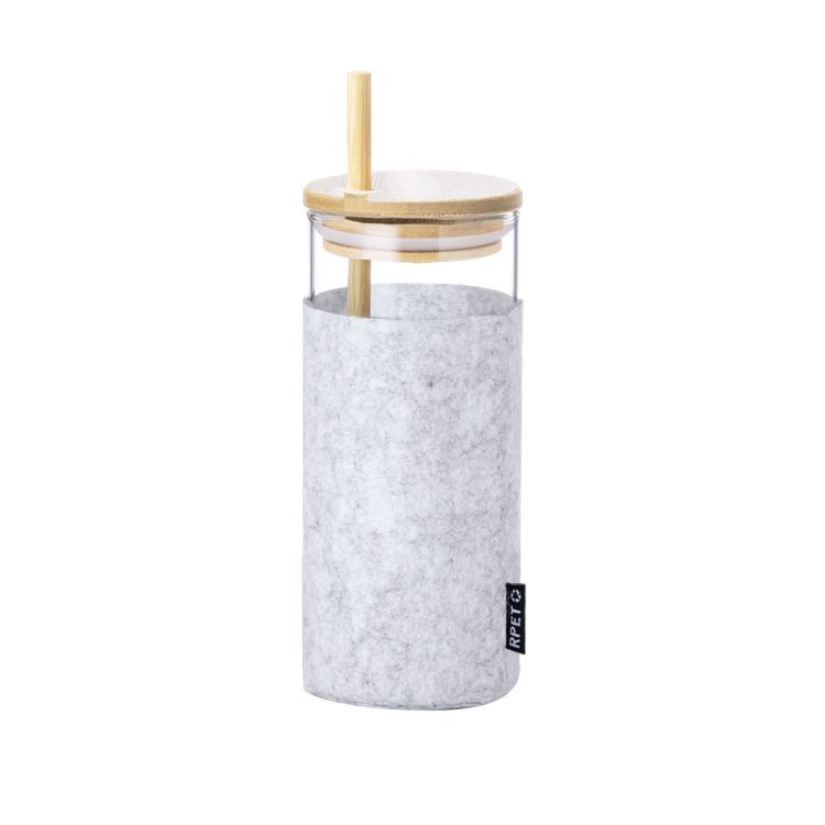 Vaso de alta calidad y 450ml de capacidad. Cuerpo fabricado en cristal de borosilicato, libre de BPA, que ofrece una resistencia y durabilidad excepcionales, alargando su vida útil y pudiendo ser reutilizado infinidad de veces. Incluye funda en suave y sostenible fieltro RPET, tapón de bambú a presión con orificio para pajita, y pajita reutilizable de bambú. Con etiqueta distintiva RPET. Presentado en caja individual de diseño eco.El fieltro RPET reciclado es fruto de la combinación del proceso de reciclaje de materiales plásticos junto a la técnica milenaria de fabricación del fieltro, dando como resultado un material de eco-tendencia que, además de ser de origen reciclado, también se convierte en reciclable. (color gris)
