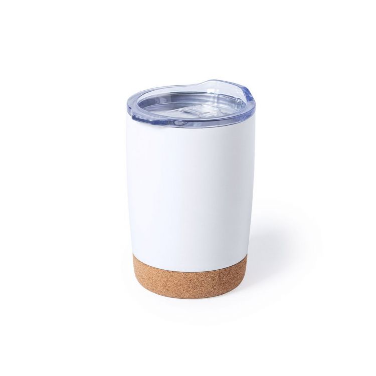 Vaso de sobremesa fabricado en combinación de base en corcho natural con cuerpo en acero inox de acabado blanco, de 380 ml de capacidad. Con doble cobertura para mejor y mas duradera conservación de la temperatura y original tapón dosificador con abrefácil transparente. Presentado en atractiva caja de diseño.