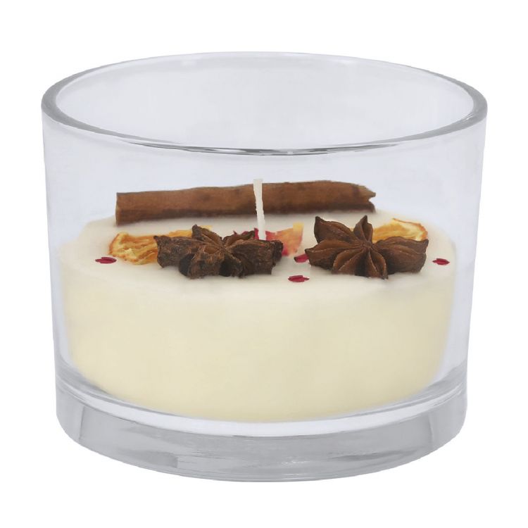 Vela aromática elaborada con cera vegetal y aroma de canela y cítricos. Con pétalos de flor rosa, rama de canela, rodajas de naranja seca y anís estrellado como elementos decorativos en la parte superior. (color blanco)