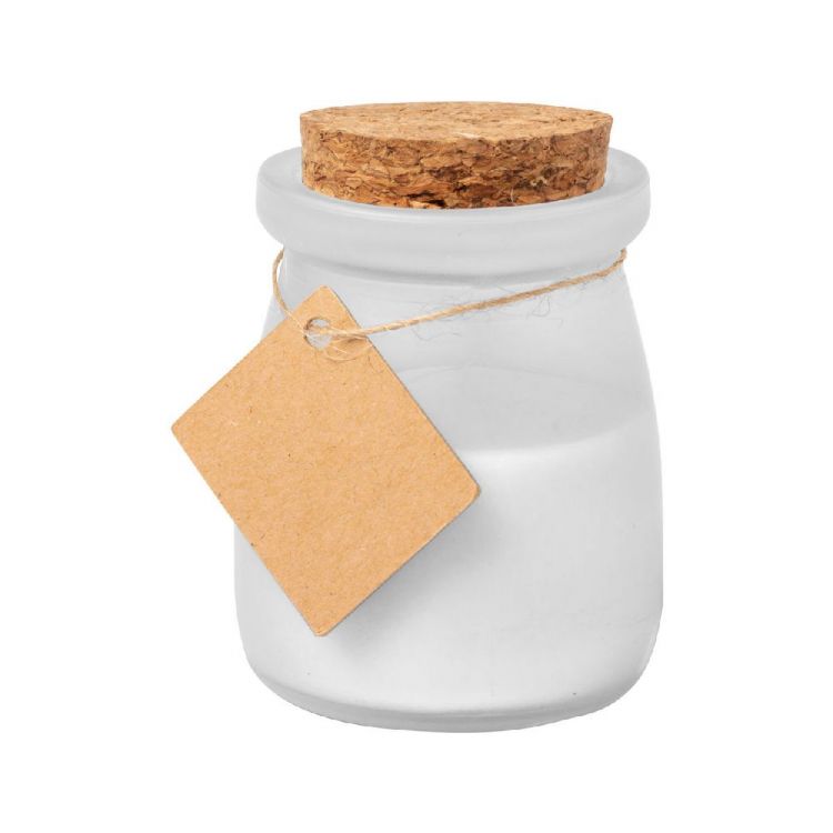 Vela perfumada en tarro de cristal con tapa de corcho.