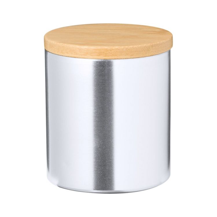 Vela perfumada de vainilla en soporte de aluminio con tapa de bambú.